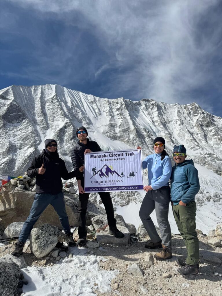 Larkya La reaches 5,160 meters, the highest point on the circuit.  Mountain panorama from Larkya La ranks among Nepal’s finest. The Larkya La pass in Spring is in its fullest form. Ponkar Tal sits blue and cold below the glacier.